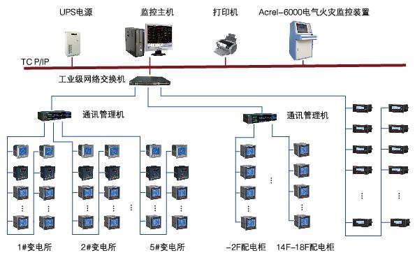 大型建筑群,樓層高,多棟樓體分散。采用Acrel-6000/Q電氣火災(zāi)監(jiān)控設(shè)備+Acrel6000/B電氣火災(zāi)監(jiān)控設(shè)備+電氣火災(zāi)監(jiān)控探測(cè)器三層結(jié)構(gòu)組網(wǎng)模式,便于區(qū)域化管理,采用RS-485網(wǎng)絡(luò)通信,以太網(wǎng)通信,滿(mǎn)足了通信實(shí)時(shí)性高的要求。